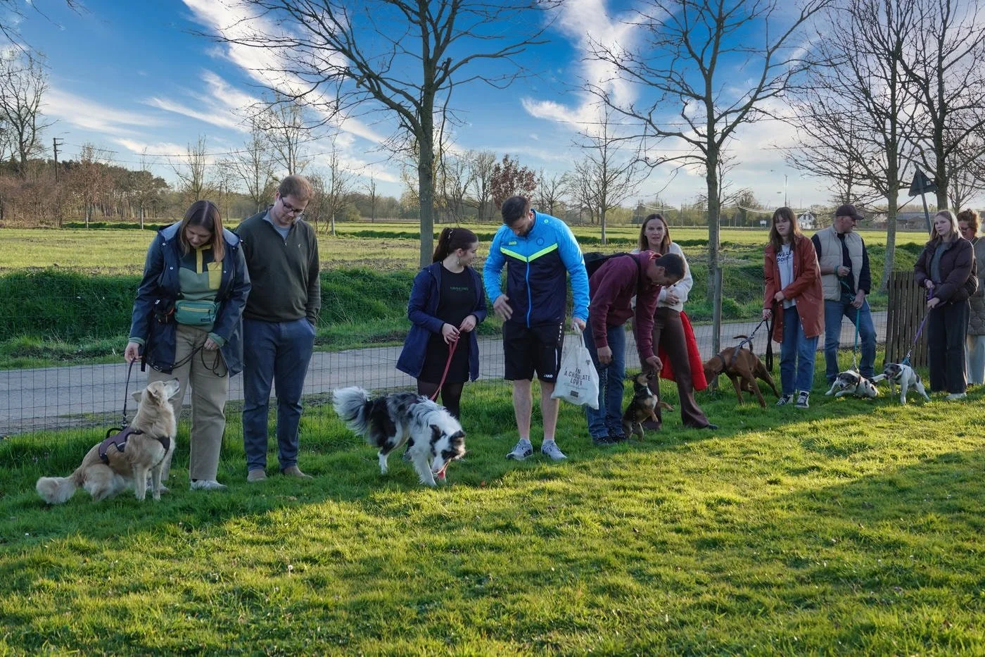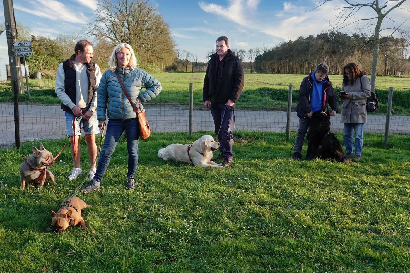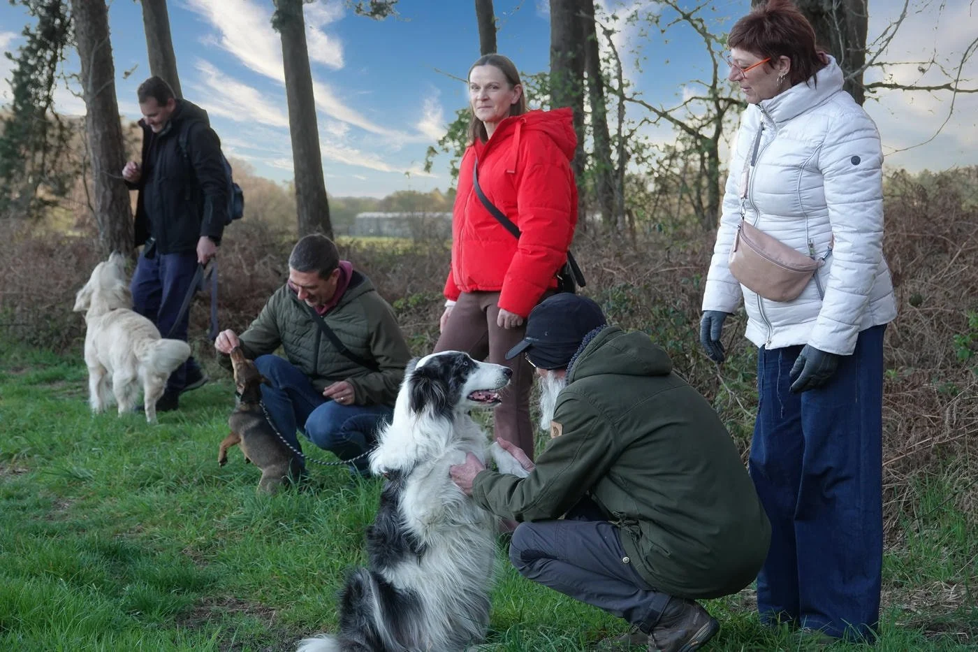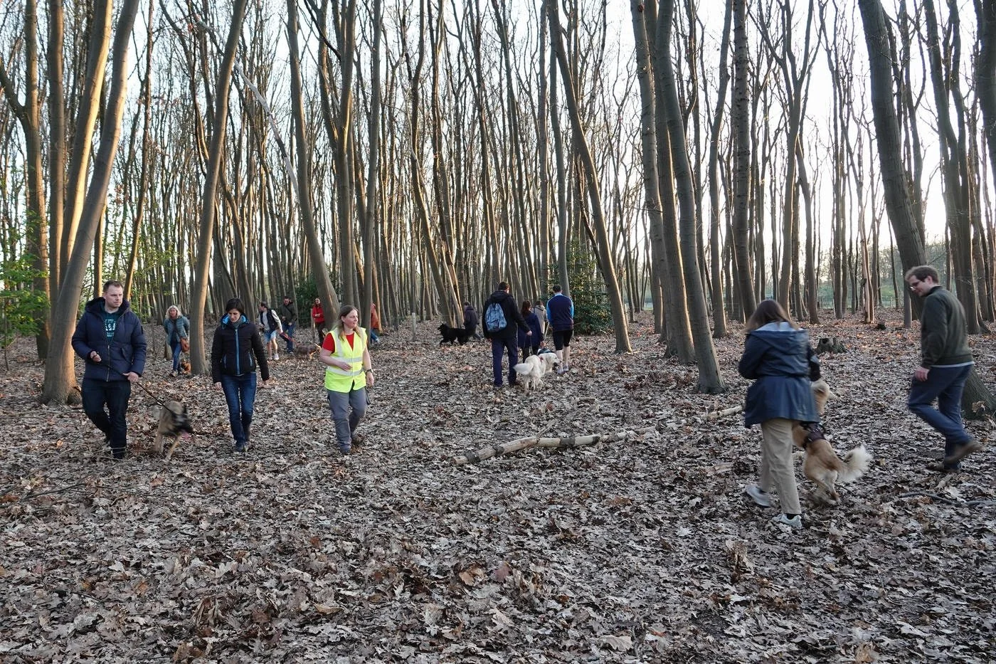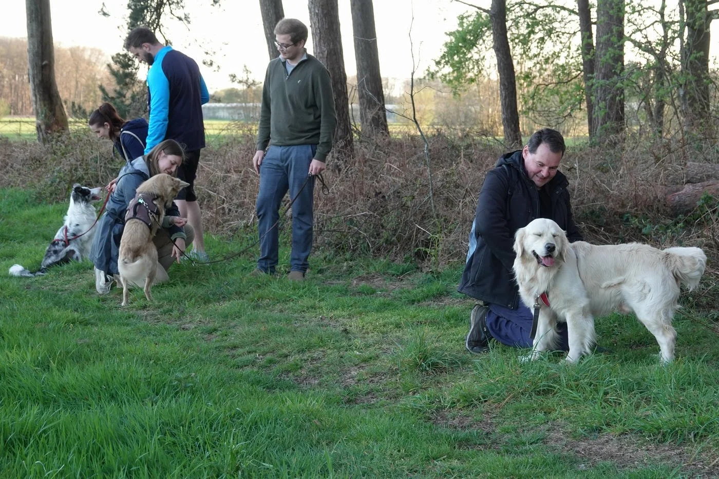 De honden waren zot als paashazen, ze snuffelden aan alles wat los en vast zat. Veel kwispelstaarten en een paar epische achtervolgingen rond de bomen later waren we allemaal kapot gelukkig.